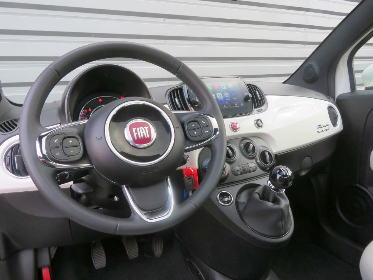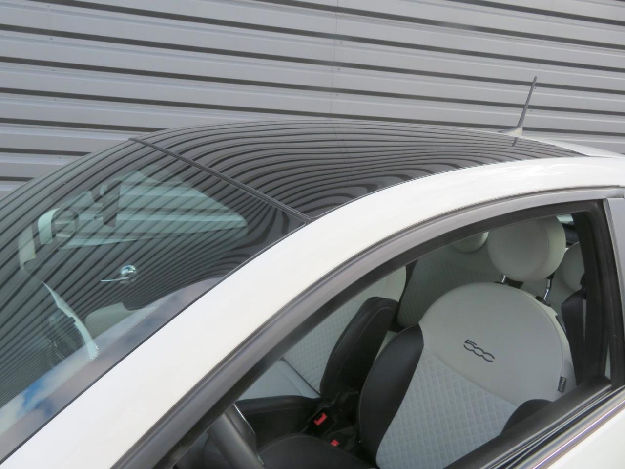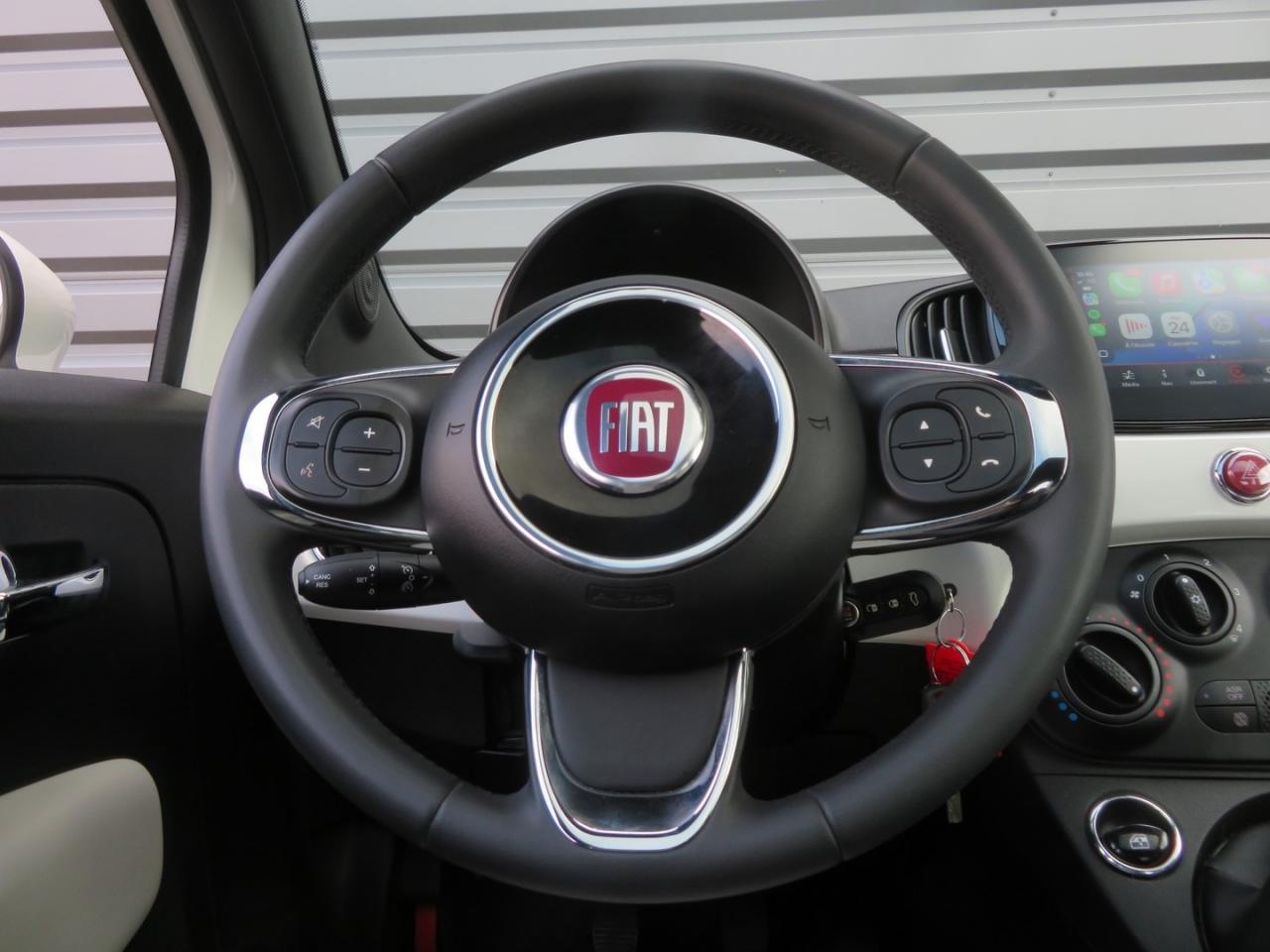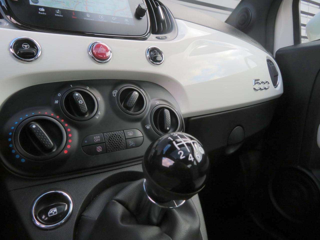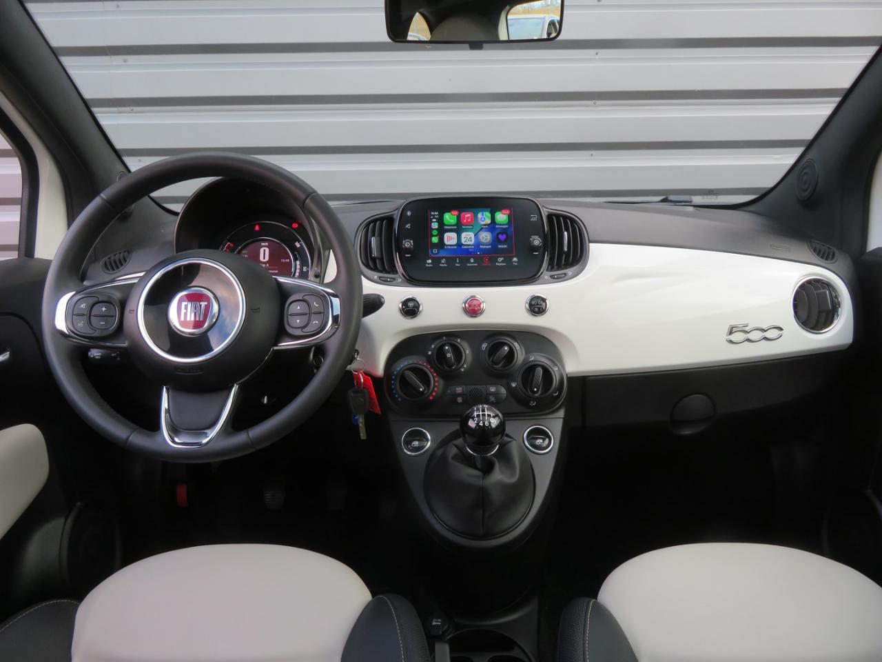 ABS – antiblocage des roues avec répartiteur de freinage EBDAir conditionnéAirbag Fiat de genouxAirbags fiat conducteur et passagerAirbags Fiat de toitAirbags Fiat latéraux avantAppuie-tête à l'avant, réglables en hauteurAssistance au freinage d'urgenceAttaches IsofixBanquette arrière rabattable avec appui-têteCalandre avec insert chroméCommandes de l'autoradio au volantCondamnation automatique des ouvrants en roulantCondamnation centralisée à distanceDirection assistée Dualdrive avec fonction"City"Eclairage du coffreESP - contrôle électronique de stabilité avec “Hill Holder"Feux de jour à LEDJantes alliage 15” New LoungeLame décorative arrière chroméeLimiteur de vitessePare-chocs couleur carrosseriePoignées de porte chroméesRégulateur de vitesseRétroviseurs extérieurs couleur carrosserieSellerie tissu matelassé blanc avec parties latérales noires. Logo 500 bordeauxSiège conducteur réglable en hauteurStart/Stop : Système d'extinction/allumage du moteur lors de courts arrêtsSystème Link : intégration Apple CarPlay et compatibilité Android AutoSystème Uconnect 7” HD (Dual Tuner / USB / Bluetooth)Toit vitré panoramique fixe avec pare-soleilVitres avant électriquesVolant réglable en hauteur
