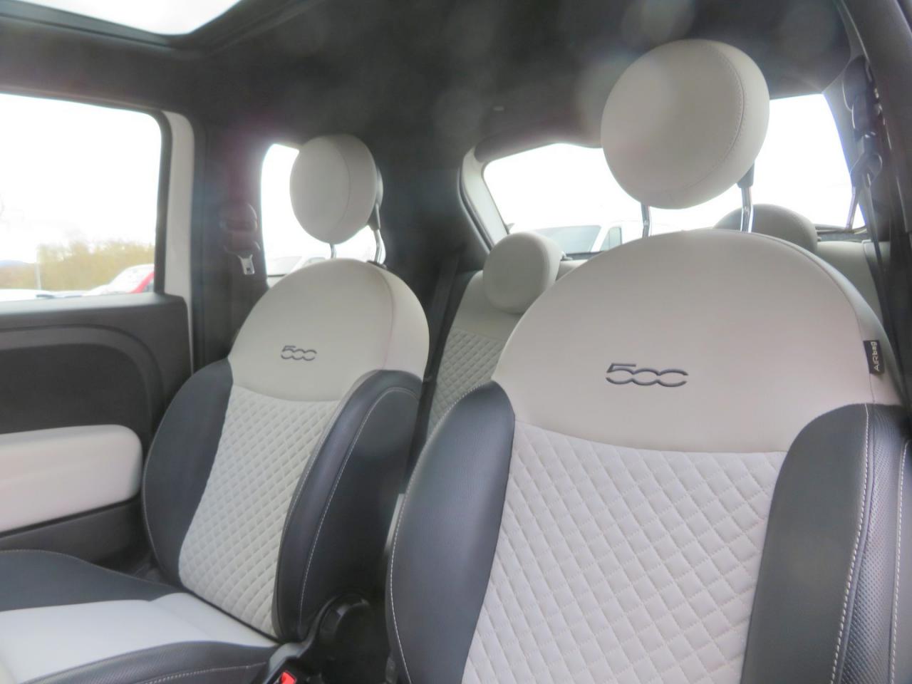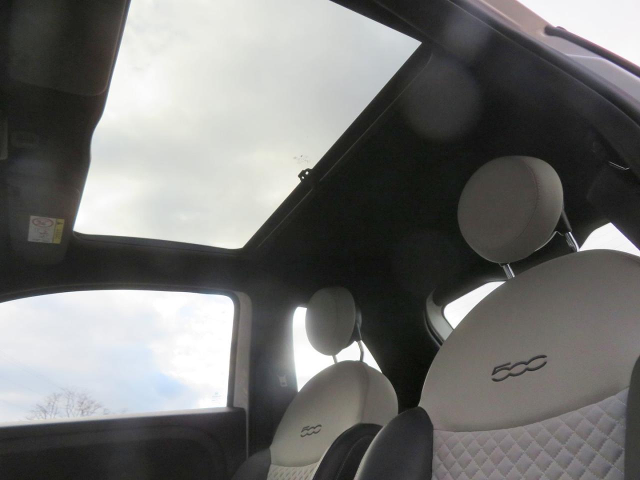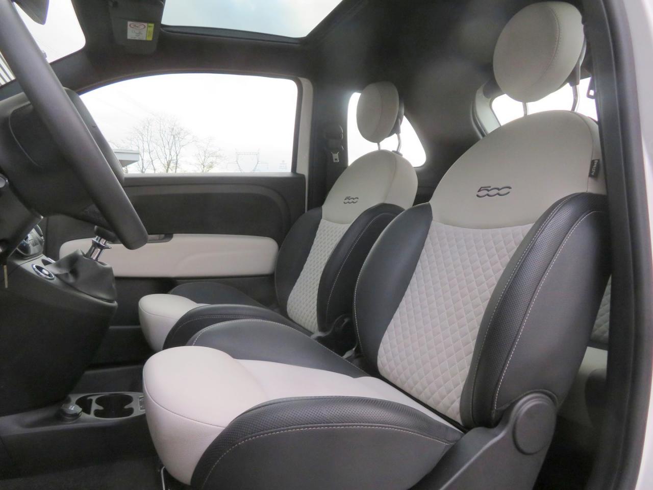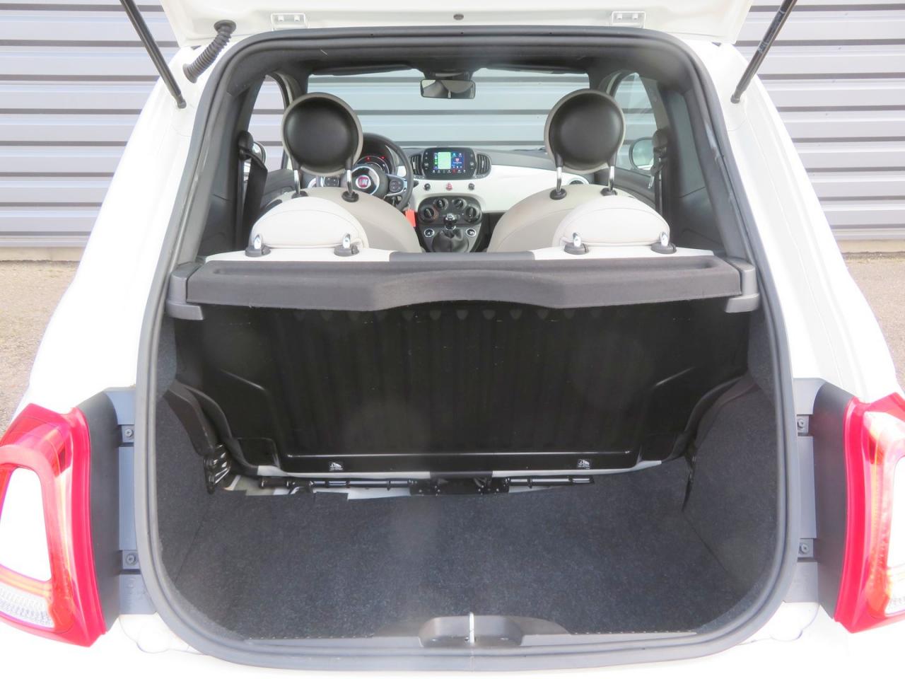 ABS – antiblocage des roues avec répartiteur de freinage EBDAir conditionnéAirbag Fiat de genouxAirbags fiat conducteur et passagerAirbags Fiat de toitAirbags Fiat latéraux avantAppuie-tête à l'avant, réglables en hauteurAssistance au freinage d'urgenceAttaches IsofixBanquette arrière rabattable avec appui-têteCalandre avec insert chroméCommandes de l'autoradio au volantCondamnation automatique des ouvrants en roulantCondamnation centralisée à distanceDirection assistée Dualdrive avec fonction"City"Eclairage du coffreESP - contrôle électronique de stabilité avec “Hill Holder"Feux de jour à LEDJantes alliage 15” New LoungeLame décorative arrière chroméeLimiteur de vitessePare-chocs couleur carrosseriePoignées de porte chroméesRégulateur de vitesseRétroviseurs extérieurs couleur carrosserieSellerie tissu matelassé blanc avec parties latérales noires. Logo 500 bordeauxSiège conducteur réglable en hauteurStart/Stop : Système d'extinction/allumage du moteur lors de courts arrêtsSystème Link : intégration Apple CarPlay et compatibilité Android AutoSystème Uconnect 7” HD (Dual Tuner / USB / Bluetooth)Toit vitré panoramique fixe avec pare-soleilVitres avant électriquesVolant réglable en hauteur