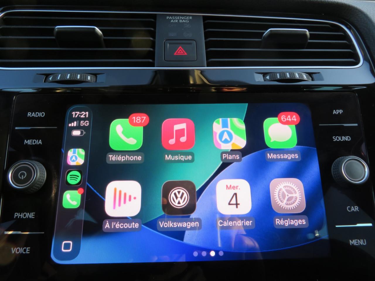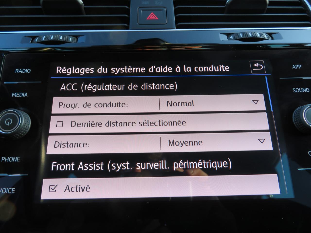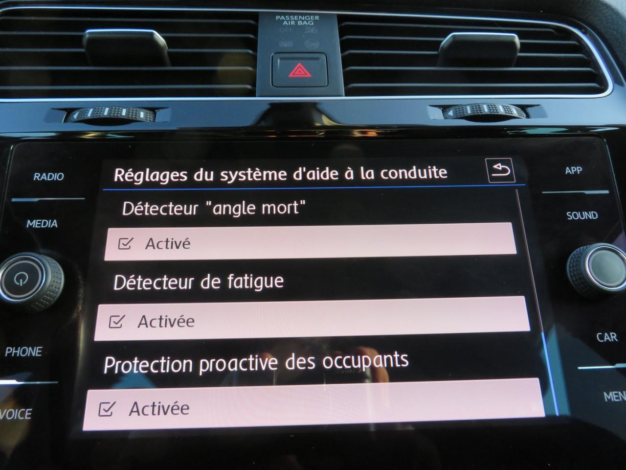 3 appuie-tête arrière3 ceintures de sécurité arrière à enrouleur à 3 points d'ancrageAccoudoir central avant réglable avec compartiment de rangement, deux porte-gobelets intégrés et deux bouches d'aération derrière l'accoudoir pour les passagers arrièreAide au stationnement avant et arrière avec signaux sonores et visualisation de la distance des obstacles sur l'écran de la radioAirbag genoux conducteurAirbags frontaux conducteur et passager (déconnectable côté passager)Airbags latéraux avantAirbags rideaux avant et arrièreAlerte de perte de pression des pneusAmplificateur de freinage BASAntenne arrière de toit intégréeAnti-démarrage électroniqueAntipatinage électronique ASRApplication Volkswagen Media ControlApplications décoratives “piano noir laqué” pour tableau de bord côté conducteur ainsi que pour console centraleApplications décoratives spécifiques pour tableau de bord du côté passager avant ainsi que revêtements de portesAppuis-tête à sécurité optimisée réglables en hauteur sur les sièges conducteur et passager avantAssistance au contrebraquageAumônière au dos des sièges conducteur et passager avantAvertisseur sonore 2 tons et témoin d'oubli du port de la ceinture de sécurité à l'avantBanquette arrière rabattable 2/3 - 1/3 avec accoudoir central et trappe à skisBlocage électronique de différentiel EDSBoîte à gants réfrigéréeBoutons d'allumage des phares avec filet chroméCache-bagages amovibleCar-Net "App-Connect"Catadioptre dans la partie inférieure des portièresCeintures de sécurité avant trois points à enrouleur, réglables en hauteur, avec prétentionneursCerclage chromé des instruments de bord et des aérateursClimatisation automatique ‘Climatronic’ bi-zone avec filtre antiallergène, réglable séparément pour le conducteur et le passager avantCompartiment de rangement au centre des deux siègesCompartiment de rangement dans le coffreConsole de pavillon avec 1 compartiment de rangement ferméCorrecteur électronique de trajectoire ESPDétecteur d’angle mort ‘Blind Spot Detection’ avec assistant de sortie de stationnementDirection électromécanique à assistance variable en fonction de la vitesseDispositif de fixation pour deux sièges enfants suivant norme ISOFIX aux places extérieures arrièreEclairage diurne à LEDFatigue Detection : Système de détection de fatigue du conducteurFeux arrière à LEDFrein de stationnement électrique avec fonction d'immobilisation en pente ‘Auto-Hold'. Le véhicule se maintient automatiquement en pente et une simple action sur l'accélérateur suffit à désactiver le freinFront assist avec freinage d’urgence et détection de piétonsInterface BluetoothJantes en alliage léger 6,5J X 16“ 'Dublin' et pneumatiques 205/55 R16 sans écrous antivolKit de dépannage : compresseur 12 volts et produit d'étanchéité de pneuLane Assistant : assistant de maintien dans la voieLave-essuie-glace arrière à balayage intermittentLight Assist : Activation ou désactivation automatique des feux de route en fonction des sources lumineuses en présenceLimiteur de vitesseMiroir de courtoisie éclairé dans les pare-soleilOrdinateur de bord multifonction avec affichage de la température extérieure, contrôle des élèments audios, de navigation, et du téléphonePack VisibilitéPare-chocs dans la couleur de la carrosseriePédalier en acier inoxydable brosséPoignées de portes couleur carrosseriePorte-boissons (2) à l'avant avec volet et porte-boissons (2) à l'arrière escamotablesPre Safe Assist' : Système proactif de protection des passagersPrise 12V dans le coffrePrise USB compatible AppleProjecteurs antibrouillard avant avec éclairage statique d'intersectionProtection anti-démarrageRégulateur de vitesse adaptatif (ACC)Régulateur électronique de couple MSRRépartiteur de freinage (EBV)Rétroviseurs extérieurs couleur noirRétroviseurs extérieurs rabattables automatiquementRétroviseurs extérieurs rabattables électriquementRétroviseurs extérieurs rabattables et réglables électriquement, avec fonction mémoire et dégivrage séparéSellerie spécifique ‘IQ.DRIVE’ en tissus noir / bleu pétroleSièges avant Confort réglables en hauteur avec réglage lombaireSign Assist: Reconnaissance des panneaux de signalisation et affichage sur l'ordinateur de bord et l'écran du système de radionavigationSpots de lecture : deux à l'avant et deux à l'arrièreSystème d'antiblocage des roues ABSSystème de Freinage anti-multicollisionSystème Start/ Stop avec récupération d'énergie de freinageVerrouillage centralisé avec télécommande à fréquence radio par clé rétractableVitres arrière électriquesVitres athermiques teintées vertesVitres avant électriquesVolant 3 branches en cuir et pommeau de levier de vitesses en cuirVolant multifonction en cuir avec commande de la radio, du système Bluetooth, de l'ordinateur de bordVolant réglable en hauteur et en profondeurXDS : Système agissant comme un différentiel autobloquant électronique permettant une meilleure motricité en courbe grâce à une répartition optimale de la puissance et du couple sur les roues avant